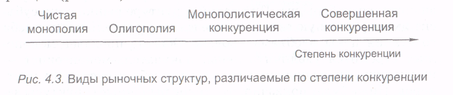 Если вдоль одной прямой последовательно расположить типы рыночных структур, выстраивая их по возрастанию степени конкуренции, то крайней слева окажется чистая (совершенная) монополия, крайней справа - совершенная конкуренция, а между ними разместятся олигополия и монополистическая конкуренция.