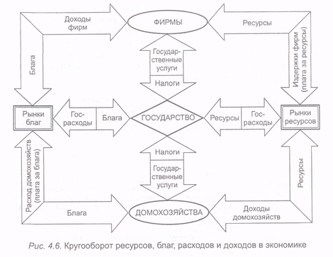 Домашние хозяйства, получив доходы от продажи на рынке своих ресурсов, тратят их на покупку благ, производимых фирмами. Так осуществляется кругооборот доходов и товаров в экономике (рис.4.6).
