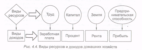 Под термином "домашнее хозяйство" не понимается какое-то производство, семейное предприятие, личное подсобное хозяйство, он никак не связан с процессом производства. Человек может работать на каком-то предприятии либо быть собственником предприятия, но одновременно являться членом домашнего хозяйства. Домашние хозяйства, владеющие ресурсами, получают факториальные доходы (доходы собственников производственных ресурсов). Выделяют следующие укрупненные виды ресурсов: труд, капитал, земля (природные ресурсы), предпринимательская способность (см. гл. 2). Их собственниками являются исключительно индивиды (домашние хозяйства), фирмы не владеют ресурсами. Правда, некоторые виды ресурсов (земля, капитал) могут также находиться в государственной собственности. С собственностью на ресурсы связаны доходы домашних хозяйств (рис.4.4).