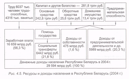С учетом того, что основная часть земельных ресурсов находится в собственности государства, земельная рента на схеме не выделена. Прибыль как доход от предпринимательской способности определить достаточно сложно, поэтому приведен другой, менее точный показатель - доходы от предпринимательской деятельности, который частично включает прибыль, доходы на вложенный капитал (процент), ренту. Кроме того, ощутимую часть доходов населения составляют государственные социальные трансферты (помощь), не связанные напрямую с обладанием ресурсами.
