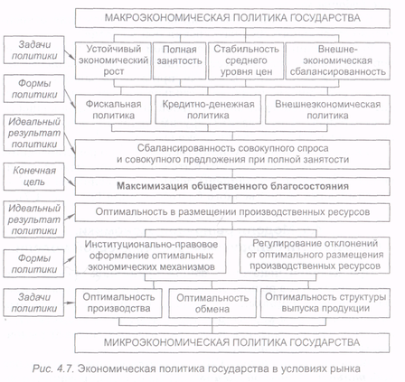 Перечисленные направления государственной экономической политики входят в сферу микроэкономической политики, т.е. ориентированы на улучшение функционирования отдельных фирм, отраслей и рынков. Но важной составляющей государственной активности является макроэкономическая политика. Общую картину отражает рис.4.7