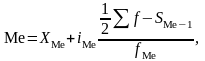 где XМе – начальное значение интервала, содержащего медиану; iМе – величина медианного интервала; f – сумма частот ряда; SМе-1 – сумма накопленных частот в интервалах, предшествующих медианному; fМе – частота медианного интервала.