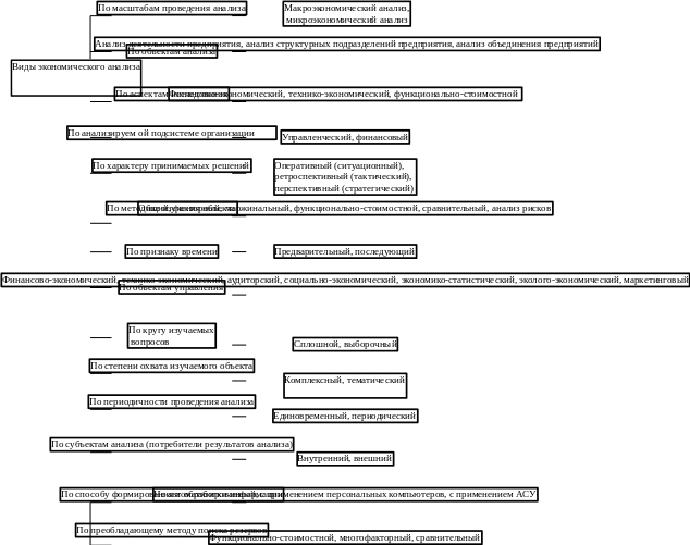 Типология видов экономического анализа определяется, в первую очередь, его целями, методами, объектами и субъектами анализа, а также широтой информационного обеспечения экономического анализа. Наиболее часто встречающиеся в литературе классификационные признаки и соответственно группировка видов экономического анализа по ним в систематизированном виде представлена на рис. 2.1. Они включают следующую классификацию видов экономического анализа.