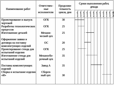 Ленточные графики составляют от конечного, заданного срока освоения производства нового изделия. Горизонтальные отрезки, которые наносятся параллельно, отражают продолжительность циклов каждой стадии, этапа или отдельной работы, рассчитанных по нормативам или экспертным путем.