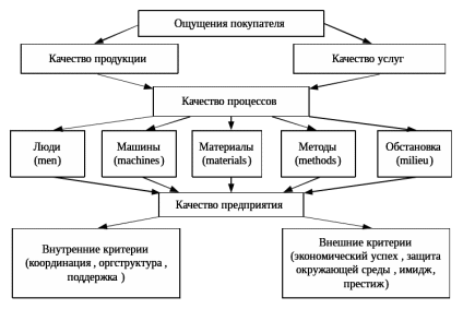На рис. 4.24 показано, что качество процессов определяется качеством «пяти m». В свою очередь компонентами «первой m» (люди) являются: информация, мотивация, квалификация, обучение, трудовой коллектив; «четвертой m» (методы) ‑ системы, организация, стиль руководства, технология. Содержание остальных «m» определяется названием компонента. Качество зависит от многочисленных и разнообразных факторов технического, экономического, социально-психологического характера. Фирмы, ведущие целенаправленную, продуманную политику повышения качества продукции и услуг, используют для достижения поставленных целей большой арсенал методов, инструментов и средств. Условно они могут быть сгруппированы в три блока ‑ методы обеспечения качества, методы стимулирования качества и методы контроля результатов работы по повышению качества.