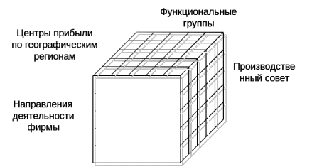 Для предприятий (фирм), действующих на международном рынке, может применяться трехмерная (тензорная) структура управления: изделие-регион- функция.