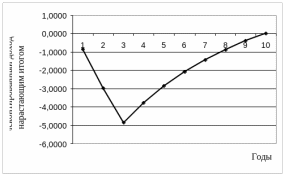 | Дисконтированный доход нарастающим итогом | -0,8400 | -2,9756 | -4,8716 | -3,7864 | -2,8668 | -2,0874 | -1,4269 | -0,8672 | -0,3928 | 0,0091 |