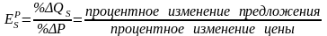 Теперь остановимся на эластичности предложения по цене. Всё, что происходит со спросом, действительно и для предложения. Экономисты ввели показатель «эластичности предложения» для того, чтобы определить степень изменения объёма предложения в ответ на увеличение цен в результате конкуренции. Эластичность предложения по ценам оценивает реакцию производителя (продавцов) на изменение цен. Мерой этого изменения выступает коэффициент эластичности предложения, который рассчитывается как отношение объёма предложения (в %) к росту цен (в %) по формуле: