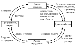 2. В основу макроэкономического анализа положена простейшая модель кругооборота продуктов и дохода, основными звеньями которой являются фирмы, домашние хозяйства. (См. рис. 1). Домашние хозяйства для удовлетворения своих потребностей предлагают в качестве ресурсов фирмам землю, труд, капитал, предпринимательские способности. Фирмы с помощью ресурсов производят товары и услуги. Возникающие взаимосвязи осуществляются в натурально-вещественной и денежной формах и бесконечно повторяются. (Первая показана на рисунке против часовой стрелки, вторая — по часовой стрелке). Основным положением модели кругооборота продуктов и дохода является равенство суммы продаж фирм и суммы доходов домохозяйств. Таким образом, заработанные в экономике доходы соотносятся с выпуском продукции и уровнем валового внутреннего продукта.