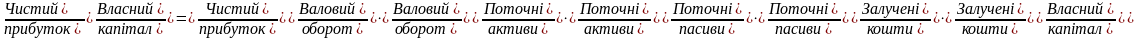 Методику побудови багатофакторної індексної моделі розглянемо на прикладі взаємозв'язку показника прибутковості капіталу з індикаторами фінансового стану та платоспроможності підприємства. Для окремої компанії (фірми, корпорації) прибутковість капіталу розраховується відношенням чистого прибутку до власного капіталу. Динаміку цього показника можна розкласти за такою множиною факторів: