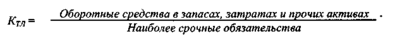 Ктл характеризует общую обеспеченность предприятия оборотными и денежными средствами для ведения хозяйственной деятельности, своевременного погашения его срочных обязательств: