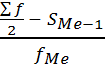 5) Медиана (Ме) – это вариант, который находится в середине упорядоченного ряда, и делит его на две равные по числу единиц части со значениями признака меньше медианы и со значениями признака больше медианы. В интервальном вариационном ряду медиана находится в медианном интервале, которому соответствует накопленная частота, равная или превысившая полусумму частот ряда, и определяется по формуле: