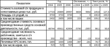 Основной показатель (стоимость валовой сельскохозяйственной продукции) в отчетном 2006 году по сравнению с базисным 2004 годом увеличился на 49,8 процентов. Площадь сельскохозяйственных угодий в 2006 году осталась без изменений и составила 3733 гектара, из них 2655 гектар или 71,1 процента занято пашней, что характеризует хорошую освоенность сельскохозяйственных угодий. В отчетном году уменьшилась площадь пашни по сравнению с 2005 годом на 200 гектар, так как за счет этих земель была увеличена площадь пастбищ. Существенно снизилась среднегодовая стоимость основных производственных средств основной деятельности в 2006 году по сравнению с базисным 2004 годом на 11,9 процентов. Снижение данного показателя повлекло значительное выбытие продуктивного скота, машин и оборудования. Хотя поголовье коров в стаде в отчетном году осталось без изменений и составило 515 голов, однако общее поголовье КРС существенно снизилось в 2006 году по сравнению с базисным 2004 годом на 21,3 процента, так как увеличилась реализация скота в живой массе и забой на мясо. По численности работников видно, что этот показатель в 2006 году ниже показателя 2004-2005 годов на 13 человек из-за сокращения численности штата. Исходя из представленных данных видно, что хозяйство не является крупным, однако оно развивается достаточно стабильно и является устойчивым.