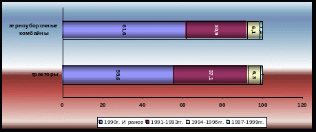 В Омской области крестьянские хозяйства испытывают недостаток техники, соответствующего сервисного обслуживания. Из-за недостатка денежных средств они в основном приобретают старую списанную технику, требующую дополнительных затрат на восстановление и ремонт (табл.4). Это, в свою очередь, не позволяет рационально использовать земельные ресурсы; в крестьянских (фермерских) хозяйствах Омской области под посевами занято менее 50% пашни. Более половины типичных хозяйств, попавших в выборку, в 2000 г. не имели тракторов, свыше трех четвертей - зерноуборочных комбайнов. Более 10% крупных хозяйств были также не обеспечены этими видами техники. Основными каналами приобретения сельскохозяйственной техники явились сельскохозяйственные организации. Каждое третье типичное хозяйство, попавшее в выборку, отметило изношенность и несовершенство техники как фактор, негативно влияющий на уровень производства. Немаловажным источником пополнения машинотракторного парка фермеров сожжет стать приобретение сельскохозяйственных машин и необходимое оборудование по лизингу, но он пока не получил среди крестьянских (фермерских) хозяйствах Омской области большого распространения.