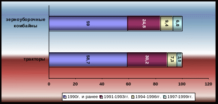 Рис.4. Распределение сельскохозяйственной техники по году выпуска в крестьянско-фермерских хозяйствах Омской области (в % от общего количества)