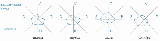 Ветер дует преимущественно юго-западного и западного направления, немного задерживаясь холмами (таблица 4). Зимой крепчают южные и юго-восточные ветра. Весной и осенью попеременно устанавливаются восточные, западные и южные ветра. Северные и северо-восточные ветра дает знать о себе чаще летом (рисунок 1).