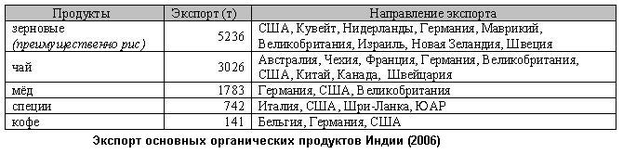 В Индии 70% всех произведенных органических продуктов экспортируются в зарубежные страны. Основные направления экспорта – Япония, Нидерланды, Италия, Франция, Швейцария, Великобритания и США. Зерновые продукты составляют основную часть экспорта, при этом риса экспортируется более 5 тыс. т (в США, страны Европы, Азии и в Новую Зеландию). Второе место занимает чай (3 тыс. т в год), который преимущественно продается в страны Европы и Северной Америки. Другими важными экспортными культурами являются мёд, специи и кофе.