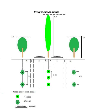 Эта закономерность определяет расстояние между ветроломными полосами (300-400 м), так как редко когда к началу полного плодоношения сада удается вырастить деревья выше 15-20 м.