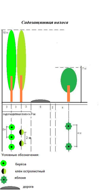 Садозащитные насаждения вокруг сада называют защитными опушками, а внутри его - ветроломными полосами. Они бывают непродувные (широкие, густые, плотные) и менее плотные - продувные. Последние лучше защищают сад и чаще всего применяются в настоящее время. Защитные опушки делают многорядными - в обычных условиях 3-4 ряда, а в местах с сильными ветрами 4-5 рядов. Если сад имеет хорошую естественную защиту, то ограничиваются 2-3 рядами, а при полной естественной защите защитную опушку можно не высаживать. При разработке данного проекта выбрана 2-х рядная садозащитная полоса.