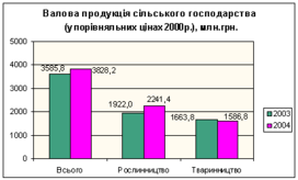 Виробництво валової продукції сільського господарства в усіх категоріях господарств у 2004 році склало 3828,2 млн. грн., що на 6,8 % більше ніж у попередньому році, у тому числі у сільськогосподарських підприємствах воно збільшилося на 26,5% і становило 2384,8 млн. грн., а у господарствах населення зменшилося на 15,1% і склало 1443,4 млн. гривень.