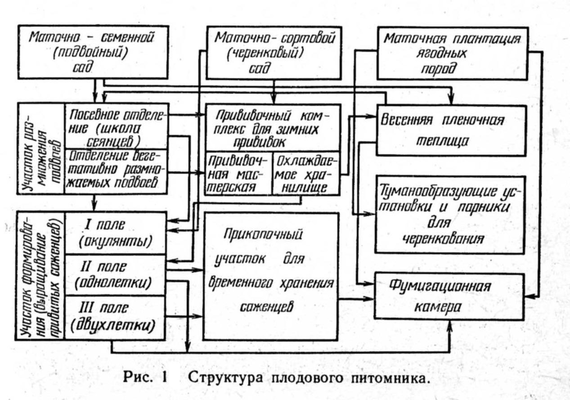 Правильно организованные крупные плодовые питомники должны иметь следующие основные составные части и сооружения: маточные насаждения, участок размножения, участок формирования, участок декоративно-лесных пород, прикопочный участок, прививочный комплекс для зимних прививок, туманообразующую установку и парники для зеленого черенкования, фумигационную камеру (рис. 1).