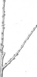Обрезка персика. Персик плодоносит па однолетних побегах, реже на укороченных букетных веточках в возрасте не более 2-3 лет. Побеги персика по характеру расположения на них ростовых и цветочных почек подразделяются на следующие типы: 1) ростовые, не имеющие цветочных почек; 2) смешанные, у которых имеются цветочные и листовые почки; 3) плодовые, покрытые цветочными почками; листовые почки имеются только на конце побега. Цветочные почки у персика бывают одиночными и групповыми.Обрезку деревьев персика проводят следующим образом: после посадки деревьев в сад укорачивают ветви первого порядка примерно на '/а их длины. Одновременно с этим применяют тщательное прореживание. Все лишние побеги и веточки, затеняющие внутреннюю часть кроны, вырезают.