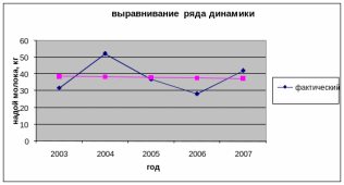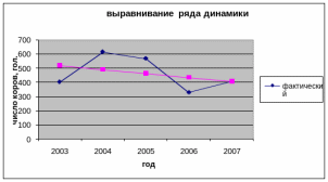 Анализ динамики приводит к тому, что мы имеем год за годом постепенное снижение продуктивности животных. Анализ значений таблицы и графика показал, что численность поголовья коров имеют тенденцию к сокращению и выравненная линия развития (тренд) численности коров, характеризуя основную тенденцию, стремительно падает вниз.