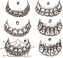 Определение возраста лошади по степени стирания передних зубов нижней челюсти (1 - резцы; 2 - средние резцы; 3 - окрайки; 4 - зацепье; 5 - чашечка; 6 - корневая звездочка; 7 - трущаяся поверхность; 8 - язычный край челюсти): а - 1 год (форма трущейся поверхности резцов округлая; след чашечки маленький и округлый; корневая звездочка в виде короткой и широкой полоски); б -5 лет (все резцы имеют чашечки; у окрайков начали стираться язычные края); в - 10 лет(форма трущейся поверхности округлая; след чашечки отодвинут к язычному краю; корневая звездочка на зацепах в виде короткой полоски; чашечка на окрайках еще сохранилась); г - 14 лет (форма трущейся поверхности еще округлая; след чашечки заметен только на одном среднем резце и на окрайках; корневая звездочка овальная); д - 18 лет (форма трущейся поверхности зацепов и средних треугольная; корневая звездочка на всех резцах круглая); е - 25 лет (форма трущейся поверхности зацепов и средних продольно-овальная; корневая звездочка на них также продольно-овальная).