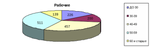 В 2007 г. по сравнению с 2006 напротив, среднемесячная выработка увеличилась на 6730 руб. или 163,75% в связи с уменьшением общей численности работников, повышение доли специалистов на предприятии из-за реструктуризации производства (для улучшения деятельности структурных подразделений), унификации технологического процесса для некоторых номенклатурных позиций, что позволило снизить время производства соответствующих изделий и уменьшить их себестоимость. Соответственно возрос и объем реализованной продукции на 155,82%, не смотря на рост себестоимости, связанный с повышением цен на материалы и комплектующие. Все это позволяет сделать вывод: в 2007 г. деятельность ОАО «Оренбургоблгаз» была более эффективной и рентабельной по сравнению с предыдущими годами.Кроме того в 2006 году в связи с увеличением числа работников произошло опережение темпа роста зар.платы над темпами выработки, что отрицательно сказалось на возможностях предприятия к формированию фондов, направляемых на дальнейшее развитие. Следует отметить и то, что в период с 2006 по 2007 гг. наблюдалась резкая диспропорция в распределении возрастного состава рабочих. Очень малое количество молодых рабочих (что тоже сказывается на производительности труда) – 15%, доля которых в современных производственных предприятиях должна составлять не менее 20%, с целью обеспечения устойчивого кадрового резерва. Наблюдается катастрофическая численность работников предпенсионного и пенсионного возраста – 42%, что существенно влияет на производительность, снижает качество выпускаемой продукции, уменьшает точность выполняемых работ. Распределение возрастного состава рабочих представлено на диаграмме «Рабочие».