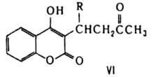 Для обработки складских помещений, трюмов, вагонов, затравки нор используют преимущественно фумиганты - SО2, HCN, CH3Br, хлорпикрин, фосфид Аl, РН3 и цианплав (технический NaCN, выделяющий HCN был запрещен еще в СССР), а также выхлопные газы автомашин и аммиачную воду. Родентициды хронического действия (антикоагулянты) наиболее эффективны и безопасны для людей. Их действие как антагонистов витамина К1 основано на ингибировании синтеза протромбина, в результате чего нарушается свертывание крови животных. К антикоагулянтам относятся производные 4-гидроксикумарина - варфарин (зоокумарин, в формуле VI R = С6Н5; ЛД100 4-8 мг/кг), кумахлор (в формуле VI R = 4-СlС6Н4), кумафурил (в ф-ле VI R = 2-фурил)и производные индандиона-пиндон (VII),