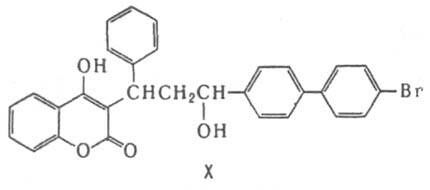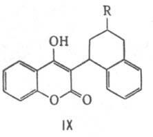 Активность варфарина возрастает при применении его в смеси с витамином D2, последний сам является 3. хронического действия, вызывающим перерождение стенок артерий, печени и почек. В связи с появлением крыс, устойчивых к ряду антикоагулянтов, найдены новые эффективные соединения - куматетралил (в формуле IX R = Н), дифенакум (в формуле IX R = 4-С6Н5С6Н4; ЛД50 1,8 мг/кг), бродифакум (в формуле IX R = 4-(4'-ВrС6Н4)С6Н4; ЛД50 0,27-0,65 мг/кг), действующий даже после однократного приема, а также бромадиолон (X).