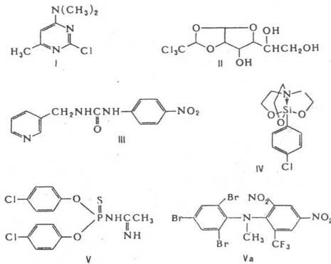 Различают родентициды острого (одноразового) и хронического действия. К первым относятся Tl2SO4, BaCO3, некоторые соединения As, однако практическое применение находит лишь фосфид цинка Zn3P2 (ЛД50 15-30 мг/кг), выделяющий при гидролизе токсичный РН3 (здесь и далее ЛД50 приведены для крыс при пероральном введении). Издавна применяют природные соединение сциллирозид - гликозид, содержащийся в красном морском луке (ЛД50 0,4-0,7 мг/кг). Ограниченное применение находят FCH2COONa (ЛД50 0,22 мг/кг) и FСН2СОNН2 - яды, для которых противоядие не известно; для борьбы с крысами используют α-нафтилтиомочевину (ANTU, крысид; ЛД50 6-8 мг/кг), с мышами - кримидин (формула I), с сусликами и полевками - глифтор (технический 1,3-дифтор-2-пропанол); за рубежом - хлоралозу (II), которая усыпляет мышей и при температурах ниже 15°С они погибают от переохлаждения. В последнее время в качестве родентицидов предложены: пиринурон (III), 5-(4-хлорфенил) силатран (IV; ЛД50 1-4 мг/кг), фосацетил (гофацид, V; ЛД50 3,6-7,5 мг/кг), каянекс CH2(NHNHCSNH2)2 (ЛД50 25-32 мг/кг), а также брометалин(Va;ЛД502-5мг/кг).