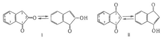 Существуют 1,2-И. (формула I) и 1,3-И. (II); молярная масса 146,14. 1,2-И. - желтые кристаллы; температура плавления - 95 °С; хорошо растворяются в кипящей воде. При нагревании с 2 молями Вr2 в уксусной кислоте (которой - ацетат Na или НВr) превращается в 3,3-дибром-1,2-индандион; окисляется, например Н2О2 в смеси разбавленной соляной кислоты и метанола до гомофталевой кислоты. Получают 1,2-И. препаративно окислением 2-гидрокси-1-инданона действием СrО3 в горячей воде. 1,3-И. бесцветные кристаллы; температура плавления 129-131 °С (с разложением); легко растворяются в горячем бензоле, не растворяются в воде и лигроине, растворяются в водных растворах щелочей с появлением интенсивной желтой окраски. Действием избытка РСl5 при 60 °С превращением в 1,1,3,3-тетрахлориндан; восстанавливается Н2 в спирте (катализатор - Pd или Pt) до индана. Вступает в реакции по активной метиленовой группе: при действии 2 молей бензилхлорида (кaтализатор - C2H5ONa) дает 2,2-дибензил-1,3-индандион и бензилбиндон (III, R = СН2С6Н5), с 1 молем бензальдегида (110-120 °С, кат.- пиперидин) - 2-бензилиден-1,3-индандион; образует биндон (III, R = Н) при действии концентрированной H2SO4 (20 °С). Легко вступает в реакцииции электроф. замещения, нитруется в уксусной кислоте при 20 °С с образованием 2-нитро-1,3индандиона, при нагревании с HNO3 в уксусной кислоте окисляется до фталевой кислоты, с реактивами Гриньяра дает 1-алкил-1-гидрокси-3-инданоны.