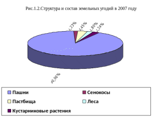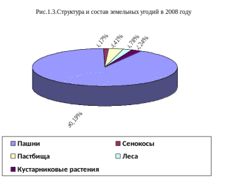 Рассматривая динамику угодий 2008г. к 2007г. видно, что площадь пашни увеличилась на 0,13%, причём сенокосы и пастбища незначительно уменьшились: на 0,06% и 0,04% соответственно. Это говорит о том, что часть сенокосов и пастбищ заняли под пашни. Поэтому количество сельскохозяйственных угодий, в общем, увеличились всего лишь на 0,03%. Площадь прудов, водоёмом, болота, леса и прочих земель осталась в прежнем размере.