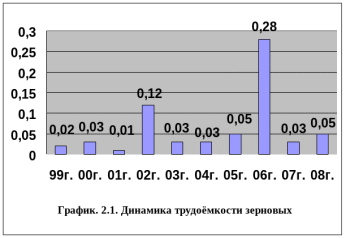 Рассчитаем показатели трудоёмкости зерновых культур по ЗАО «Яснополянское» за последние 10 лет и рассмотрим их в таблице 2.1.