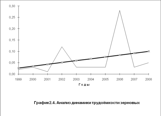 . Показатели цепного абсолютного прироста говорят о том, насколько увеличилась или уменьшилась трудоёмкость зерновых по предприятию за данный период, по сравнению с предыдущим. И, следовательно, можем дать оценку о производительности зерновых по данному периоду.