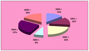 2000 г. – 14*3,6о=50,4о; 2001 г. – 13*3,6о=46,8о; 2002 г. – 79,2о; 2003 г. – 28,8о; 2004 г. – 97,2о; 2005 г. – 57,6о. Всю посеянную площадь за 6 лет принимаем за 100%, таким образом, доля каждого из составляющих годов становится, хорошо видна.