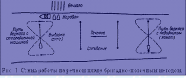 ущность его заключается в том, что вместо болшого количества индивидуально работающих лодок на плаву работает одна бригада, в которой обязанности строго распределены между рыбаками. Сети набирают на большую лодку или неводник. Мотобаркас выводит неводник к началу плава, где последовательно выметываются одна за другой все сети бригады с соблюдением необходимых интервалов. Сети сводят с неводника самометом или их выметывают 1-2 рыбака. Сети сплывают по течению на двух маяках без лодок, по пути улавливая встречную рыбу. Такое свободное сплывание возможно на большинстве плавов. В конце плава сети встречают рыбаки, которые на лодках или с мотобаркаса выбирают их из воды, выпутывают рыбу и сдают ее на стоящий рядом приемный пункт. По мере накопления обработанных сетей их снова отправляют вверх к началу плава. Применение мотобаркаса на выборке сетей позволяет использовать сетеподъемную машину кулачкового типа, которая успешно применяется на ставном сетном лове. Преимущества бригадно-поточного метода заключаются в следующем: улучшается организационная структура плавного лова; сокращается численность рыбаков, занятых на плаве; повышается производительность труда рыбаков; снижается себестоимость продукции; появляется возможность внедрить комплексную механизацию лова (замет-сплывание-выборка сетей). Если плав находится вдали от рыбозавода, РТС, рыболовецкого хозяйства и т. д., то необходимо установить на нем стан. На стане, должны быть места и вешала для обработки сетей, их просушки и ремонта, котлы или бочки для дезинфекции сетей, легкие постройки для ночлега и отдыха рыбаков. Должно быть организовано культурно-бытовое обслуживание рыбаков, снабжение продовольствием и т. п. У стана необходимо располагать и приемные пункты для сдачи уловов.