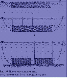 Лов плавными сетями в реке называется речным плавным ловом, а участок реки, на котором проводится этот лов, - плесом или плавом. Плавными сетями ловят с мелких речных судов - обычно лодок. Рыболовецкое звено состоит из двух человек. Рыбу ловят одной сетью, цельной или состоящей из нескольких коротких сетей. Сеть набирают непосредственно в лодку, ящик или брезент в порядке, обратном выметыванию. Лов начинается со спуска в воду буя или маяка, называемого в некоторых бассейнах куренем. В качестве маяка применяют деревянную крестовину с шестом, на конце которого крепят какой-нибудь отличительный знак - вымпел, метелку или пучок травы. Для придания устойчивости к нижнему концу шеста подвязывают груз. Иногда вместо крестовины устанавливают шест, к середине которого подвязывают плав, а к нижнему концу - груз. Шест плавает в вертикальном положении. На конец его, находящийся над поверхностью, привязывают отличительный знак. Если рыбу ловят ночью, то к маяку крепят зажженный фонарь.