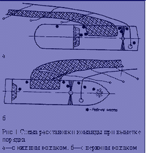 Процесс лова дрифтерными сетями состоит из следующих операций: подготовки к лову, выметки порядка, дрейфа, выборки порядка, выпутывайия рыбы и уборки порядка. В тех случаях, когда рыбу из сетей не выпутывают, а вытряхивают, этот процесс совмещен с выборкой порядка. Подготовка к лову включает подготовку рабочего борта, освобождение палубы от ненужных предметов, проверку промысловых механизмов и подготовку орудия лова, заключающуюся в проверке вожака, размолаживании его и снабжении марками (если он новый) и в укладке его для лова. Вожак укладывают либо в специальный отсек, либо на палубе судна. Затем начинают набирать сети, т. е. укладывают их у борта судна в порядке, обратном выметыванию, и последовательно соединяют одну с другой приухами. В порядках с нижним вожаком нижнюю подбору койлают в сторону носа судна, а верхнюю-ближе к надстройкам, а в порядках с верхним вожаком-наоборот. Это объясняется тем, что вожак сходит за борт через мальгогер, установленный в носовой части, и вожаковые поводцы идут в первом порядке от нижней подборы а во втором-от верхней, поэтому в первом случае к мальгогеру должна быть расположена нижняя подбора, а во втором - верхняя. Сети соединяют концами (огонами) вожаковых и буйковых поводцов поэтому при связывании приухов одновременно подвязывают поводцы. Поводцы должны быть разобраны и уложены в порядке, удобном для выметки. Подготовляют и надувают буи, соединяют их с поводцами и укладывают в необходимом порядке. В порядках с верхним вожаком сети оснащаются загрузкой. Обычно подготовка к лову производится во время переходов судна с тем, чтобы, прибыв на место лова, можно было, не теряя промыслового времени, приступить к выметке сетей. Сети выметывают различными способами. Наиболее простым является следующий способ. Судно становится рабочим бортом на ветер. За борт опускают маяк с подвязанным к нему подмаячным концом и начинают травить его Ветер, дуя в борт, постепенно относит судно от маяка. Когда подмаячный конец сойдет за борт, вяжут к первой марке вожака вожаковый поводец и выносят за борт кромку первой сети с поводцами и буйком. По мере того как ветер относит судно, за борт сходит первая часть вожака, присоединенная к подмаячному концу, и первая сеть. Когда подойдет вторая марка вожака, к ней вяжут второй _поводец и в воду сходит вторая сеть. При выметывании вожака и сетей за борт последовательно сбрасывают буйки. Таким образом в воду сходят все сети, и порядок вытягивается в линию. Затем стравливают необходимое количество стояночного вожака и переносят точку его крепления на нос судна. От этого судно разворачивается носом к порядку. На этом процесс выметки заканчивается и начинается следующий процесс - дрейф судна с порядком. Подобный способ выметки прост и безопасен, но занимает много времени. Поэтому в последнее время рыбаки стали выметывать сети несколько иначе. Судно становится лагом к ветру и при застопоренной машине приступает к выметке порядка. Когда судно несколько отнесет от сетей, машина дает ему толчок вперед, при этом руль держат так, чтобы сети не попали под винт. Как только сети начнут подходить к корме, машину стопорят, а судно с выровненным рулем по инерции продолжает двигаться. Эту операцию повторяют несколько раз, пока весь порядок не будет выметан. Порядок при этом в плане имеет ви
