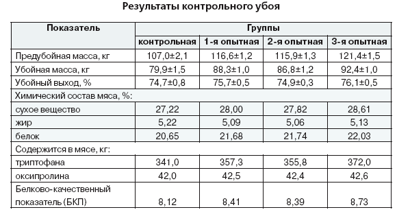 В составе полнорационных комбикормов на долю дерти кукурузной приходилось 30–34,5% и жмыха подсолнечникового — 13,5–15% от потребности в обменной энергии. Откорм подсвинков продолжался 145 дней. В возрасте 205–220 дней провели контрольный убой подопытных животных, для чего из каждой группы отобрали по 3 типичных головы. В таблице 4 приведены результаты контрольного убоя.