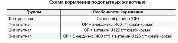 Условия интенсивного откорма свиней требуют непременного включения в рецептуру полнорационных комбикормов добавок биологически активных веществ. Выбор этих добавок, как правило, обусловлен составом рациона. Как влияют рекомендуемые добавки на производство свинины в нашей зоне, где зерновая часть комбикормов представлена в основном кукурузой, а протеиновая — подсолнечниковым жмыхом, мы решили определить опытным путем. Исследовали применение ферментного препарата Энерджекс датской фирмы «Ново-Нордиск», который обладает β-глюканазной, пектиназной и гемицеллюлазной активностью, а также витамина U с его противогастритным и противоязвенным свойствами. Использование этого витамина особенно важно, когда преобладает растительный тип кормления.
