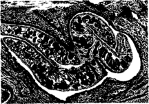 Фасциолез. Тела паразитов в просвете небольшого желчного протока