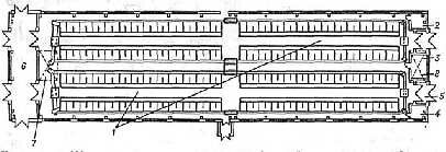 Коровник для коров привязного содержания: 1 - стойловое помещение: 2 - помещение для подстилки; 3 - фуражная; 4 - инвентарная; 5 - тамбур; 6 - помещение навозоудалекия; 7,8 - венткамеры.