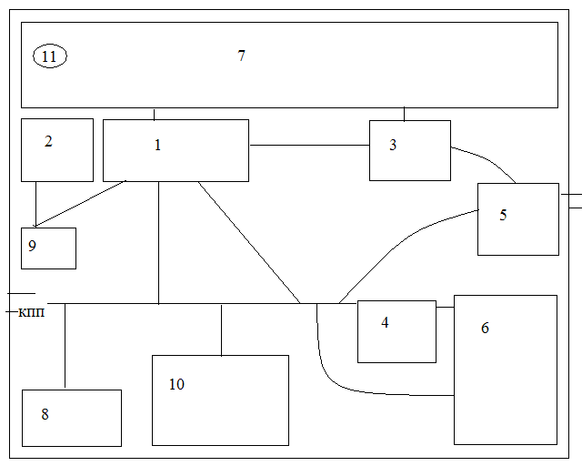 1-коровник, 2-телятник, 3-доильный зал, 4,6-кормохранилища, 5-отсек хранения молока, 7-луг, 8-навозохранилище, 9-ветпункт, 10-хозяйственная постройка, 11-водонапорная башня.