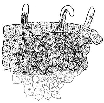 Рис.4 Схема возникновения инфекционных нитей. В неискривленном корневом волоске видны две инфекционные нити, в искривленном — одна разветвляющаяся (по Ф. Бибердорфу).