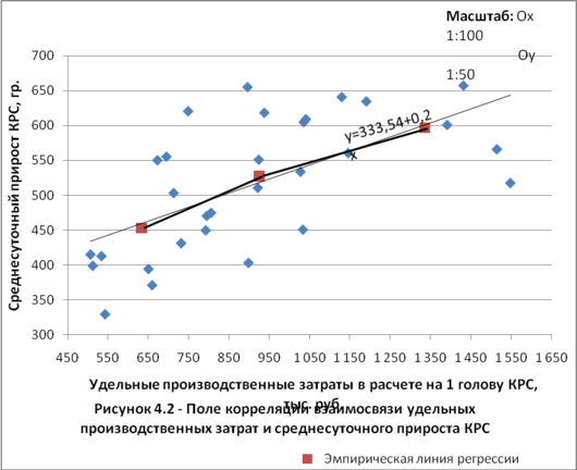 Из уравнения видно, что увеличение удельных производственных затрат на 1 голову на 1 тысячу рублей вызовет увеличение среднего суточного прироста живой массы КРС на 0,2 грамма. Это свидетельствует о существенном влиянии удельных производственных затрат на средний суточный прирост живой массы КРС. Изобразим связь на графике (рисунок 4.2).