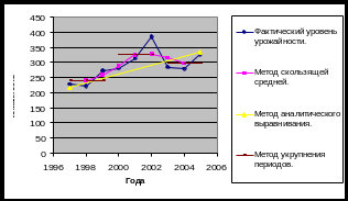 Анализируя вышеприведенные расчеты можно сделать вывод о том, что в среднем за период с 1997 по 2005 годы урожайность сахарной свеклы имеет тенденцию к увеличению в среднем на 11,7ц/га, а базисная урожайность при этом составляет 228,6 ц/га.