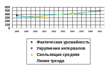 На рисунке 1 представлены 4 линии, которые характеризуют: фактическую урожайность; среднюю урожайность, укрупнённую по интервалам; среднюю урожайность, скользящую по средней и аналитическую урожайность сахарной свёклы. Графическое изображение урожайности отражает данные выравнивания аналитического ряда. Анализируя график, видим, что фактическая урожайность колеблется из года в год. Прямая средней урожайности укрупнённой по интервалам и скользящей средней имеет восходящий характер, что говорит о увеличении урожайности сахарной свёклы за исследуемый период.
