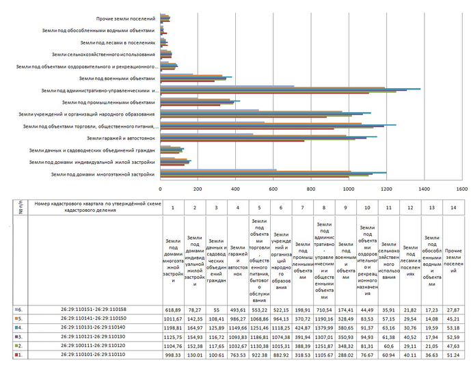 | Номер кадастрового квартала по утверждённой схеме кадастрового деления | Земли под домами многоэтажной застройки | Земли под домами индивидуальной жилой застройки | Земли дачных и садоводческих объединений граждан | Земли гаражей и автостоянок | Земли под объектами торговли, общественного питания, бытового обслуживания | Земли учреждений и организаций народного образования | Земли под промышленными объектами | Земли под административно-управленческими и общественными объектами | Земли под военными объектами | Земли под объектами оздоровительного и рекреационного назначения | Земли селькохозяйственного использования | Земли под лесами в поселениях | Земли под обособленными водными объектами | Прочие земли поселений | |